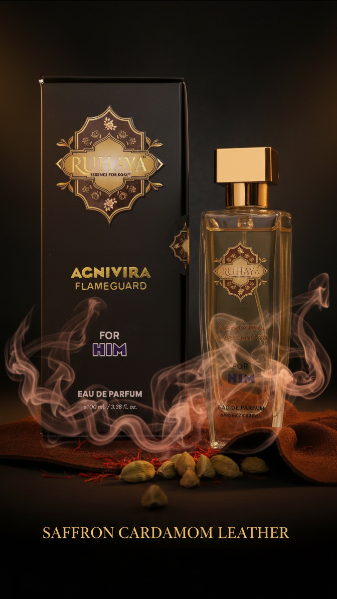 “The Fiery Spirit of a Warrior — Smoky Oud, Warm Spices, And A Heart of Leather.”